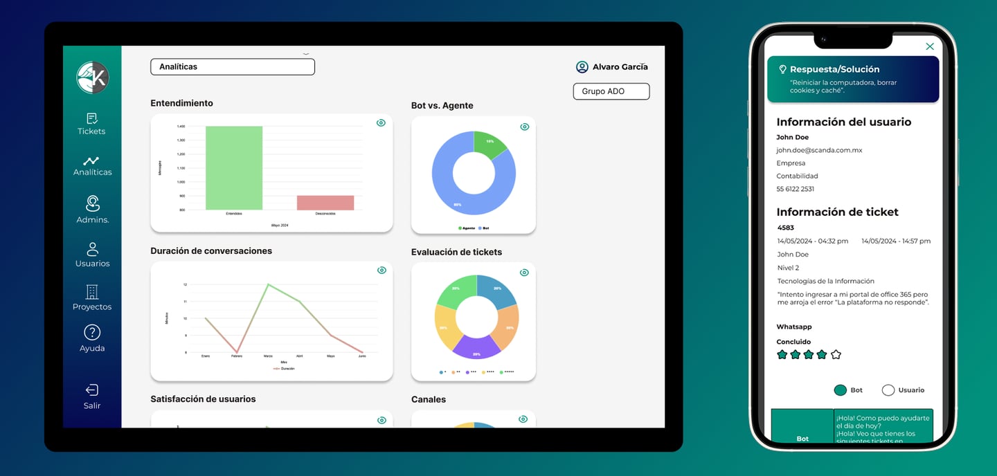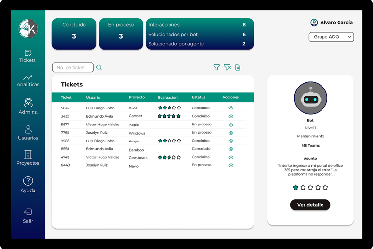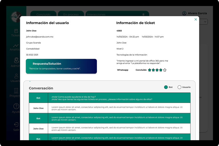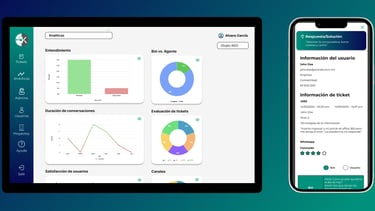 Al iniciar sesión el usuario final y el agente tienen, además de un registro de sus tickets de solución, distintos medios de comunicación para iniciar una conversación, en caso de que la IA no tenga la respuesta exacta, automáticamente la conversación es redigirida a un agente para una atención personalizada.
