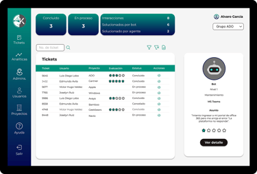 Como parte vital de la herramienta, el usuario tiene la posibilidad de visualizar los tickets atendidos por la IA o por el agente, con la funcionalidad de ver la conversación en tiempo real y hacer la curación de respuestas para ofrecer una atención más certera y mejorable.